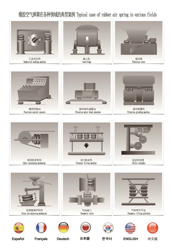 由于空氣彈簧擁有如上特點(diǎn),被日益廣泛的應(yīng)用于汽車、造紙機(jī)、升降舉升臺(tái)、壓力機(jī)振動(dòng)運(yùn)輸機(jī)、振動(dòng)篩、空氣錘、振動(dòng)試驗(yàn)機(jī)鑄造機(jī)械等需要進(jìn)行行程控制或減振、隔振的設(shè)備或儀器上。